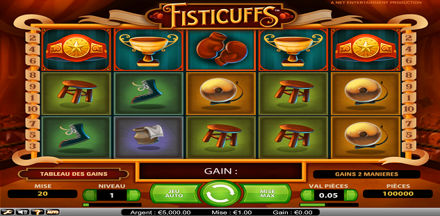 Fisticuffs biedt je de mogelijkheid aan om te spelen met krediet ten bedrage van 10 per betaallijn, gegeven dat er 10 lijnen gebruikt worden en dat de waarde van de munten gemakkelijk kan schommelen tussen €0,01 en €1, wat je dus toestaat om een maximum inzet van €100 per keer te plaatsen. Deze slot is misschien niet heel rijk in functionaliteit, maar het is ideaal voor beginners of om mee te oefenen. Ze heeft desalniettemin een aantal minimale bonusfunctionaliteiten en je kan er uiteraard het onmisbare en onvergetelijke wild symbool terugvinden dat je kan vervangen met eender welk ander symbool om je winkansen aanzienlijk te vergroten. Misschien kom je zelfs wel een nieuwe bonus tegen. Deze laat je een boksmatch bijwonen waar het lijkt alsof de match niet zozeer gelijk is voor één van de boksers. Of dat is toch het minste wat je kan zeggen…maar wij laten het een verrassing die jij kan ontdekken. NetEnt biedt je met deze slotmachine een origineel thema aan dat geoptimaliseerd is voor een dynamische ervaring. Ze is echt interessant dankzij de aanpasbare inzet zodat het toegankelijk is voor ieder budget. Fisticuffs is dus een slot om zo snel mogelijk uit te proberen!