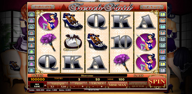 De French Maid slotmachine beschikt over 5 rollen met 20 betaallijnen en telt veel variabelen waarmee je je inzet gemakkelijk kan instellen. Voordat je spint, kan je de waarde van je munten kiezen met een som die ligt tussen €0,01 en €1. Verder kan je het aantal ingezette munten en het aantal actieve lijnen aanpassen om tot een maximum inzet van €100 te komen. De talrijke bonussen in het spel zijn ook niet te negeren. Je kan bijvoorbeeld toegang krijgen tot een minispel waarmee je tot €100.000 kan winnen als 3 bonussymbolen die een hotel afbeelden verschijnen op de rollen. Maar er is nog een andere bonus die op dezelfde manier wordt geactiveerd, waarmee je tot €10.000 kan winnen als er minstens 3 symbolen van de Eiffeltoren tegelijkertijd op de rollen 1, 3, en 5 verschijnen.