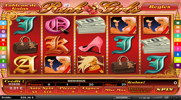 De Amerikaanse ontwikkelaar, IGT, blijft opnieuw in het thema van geld, macht en vrouwen. Deze keer kan je het dagelijkse leven van een jonge rijke dame beleven in de slotmachine Rich Girls. Het uitbetalingspercentrage ligt tussen 92,52% en 96,18% in dit spel met mooie cartoon graphics op de achtergrond omringd door een purperen kader, arabesken en enkele bloemen. Op de rollen zal je symbolen kunnen ontdekken die goed passen binnen de gezellige, kleine wereld van de heldin in dit spel, zoals het hoofd van een miljardair, een gekamde hond met een blauwe strik, een witte kat met een edelstenenketting rond haar nek. Tussen de luxe-objecten liggen ook een smaragd, een diamant, een topaas en een saffier. Daarnaast zal je ook iets fruitigere symbolen zoals pruimen, citroenen, kersen, watermeloenen en perziken ontdekken, net als op de traditionele eenarmige bandieten. Ten slotte kunnen we ook het gezicht van de jonge erfgename niet vergeten!