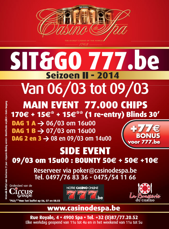Speel mee in het SIT & GO 777.be pokertoernooi van Casino de Spa van 06.03.14 tot en met 09.03.14. Stuur je reservering naar [email protected].