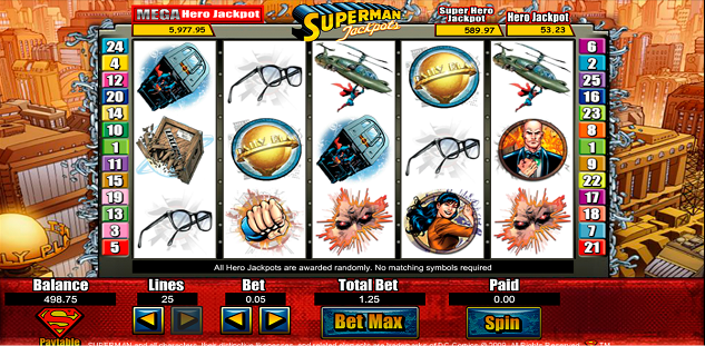 Globaal bekeken merk je meteen op dat het thema van de slotmachine meer gebaseerd is op de stripreeksen dan de films over Superman, met mooie tekeningen en symbolen maar verder ook talrijke 3D-animaties die misschien wel wat meer aandacht verdienden. De achtergrondmuziek mengt zich mooi met de inhoud en geeft het spel een dynamische touch. Deze slot maakt gebruik van het principe van bijkomende inzetten en beschikt over 50 lijnen en bestaat verder ook uit 5 rollen die 4 vierkanten hoog zijn en waarop 50 betaallijnen zijn gestoeld, gaande van links naar rechts. Wat betreft de inzetten, deze zijn uitgebreid omschreven in de spelregels en je moet eenvoudigweg weten dat indien je als speler de inzet wenst te verhogen, je dan de waarde van de stukken niet kan verhogen en ook geen meerdere stukken per lijn kan inzetten.